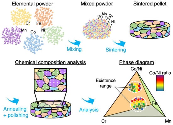 High-entropy alloys (HEAs) have been expected to exhibit unique physical properties since the idea of a high-entropy alloy was introduced in the metallurgy field by Cantor and Yeh [1,2]. HEAs are defined as solid-solution alloys composed of more than five elements with intermediate compositions and hence, stabilized due to extremely high configurational entropies [3]. Such unique atomic arrangements and atomic interactions have the potential to give rise to properties creating the so-called cocktail effect, which is not possible from a simple mixture of elements. The Cantor alloy is well known as a prototype of HEAs, with the FCC structure exhibiting a unique mechanical property, which displays high strength at low temperatures. This FCC phase has been reported to have a wide existence compositional range [4] implying the ability to control the physical properties by changing the composition while retaining the crystal structure. A number of studies examining the stability [5,6,7,8,9] or the composition range [10,11,12,13,14,15,16,17,18,19,20] of the HEA phase have been conducted experimentally and with the aid of CALPHAD calculations, even for the Cr–Mn–Fe–Co–Ni system alone. However, all these studies have been conducted on pseudo-binary sections of the quinary system and hence, the entire picture of the existence range of the high-entropy Cr–Mn–Fe–Co–Ni alloys is still unknown. A tremendously vast compositional space of a multicomponent system such as HEAs requires an enormous amount of effort to examine their detailed phase diagrams.