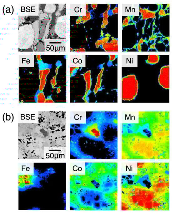 The microstructures of the SDM samples were observed using a scanning electron microscope, equipped with an electron-probe microanalyzer with wavelength dispersive X-ray spectroscopy (EPMA; EPMA-8050G, Shimadzu Corp., Kyoto, Japan). The chemical compositions were mapped in a grid pattern at 1–2 μm intervals for several regions with 200 μm × 200 μm areas at an acceleration voltage of 15 kV and a 1 μA current for 8 ms per point. The measured intensities of the characteristic X-rays Cr Kα, Mn Kα, Fe Kα, Co Kα, and Ni Kα were converted to chemical compositions via the ZAF-correction method using intensities from elemental standard samples.