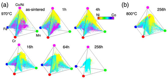 The chemical compositions obtained by WDS mapping analysis shown in Figure 2 were plotted in the Cr–Mn–Fe–Co/Ni tetrahedral compositional space of Figure 3. As one can see from the data at 970 °C shown in Figure 3a, as the annealing time increases, the measured compositional points in the sample, on the whole, gradually shift towards the equiatomic composition due to interdiffusion, and come together near the center at the end (~256 h). Therefore, it is reasonable to use data obtained for up to 256 h of annealing. At 800 °C, the only data from the annealing for 256 h seems to cover a large compositional space (Figure 3b). Since it covers a wide compositional range at either temperature, it is hard to identify the compositional range of the phases present merely from Figure 3. Because the compositional analyses are performed at a large number of random points, the measurement points include those obtained from points on phase boundaries in the sample space and provide the apparent compositions in the miscibility gaps in the compositional space.