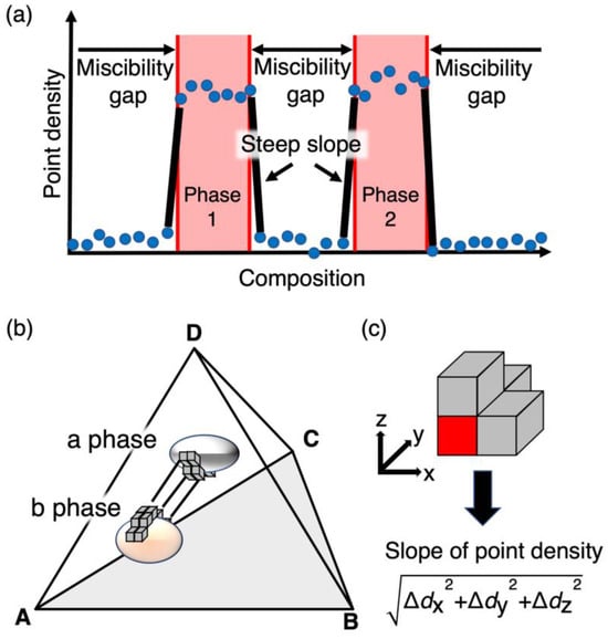 To address this issue, we introduce point density in the compositional space. The tetrahedral compositional space among Cr–Mn–Fe–Co/Ni, Figure 4b, is divided into elemental cubes, with an edge the length of which is one hundredth of an edge of the whole tetrahedral compositional space, and the number of measured compositional points per elemental cube is defined as the point density. As shown Figure 4a, point densities within compositional ranges of existing phases are expected to be higher than those in the miscibility gaps, since measured points are located in miscibility gaps only in cases where the electron probe happens to be located on the phase boundaries. Therefore, the absolute value of the slope of point density is thought to be maximal at the phase boundaries. Thus, the phase boundary surfaces can be represented by the maximal slope of point density.
