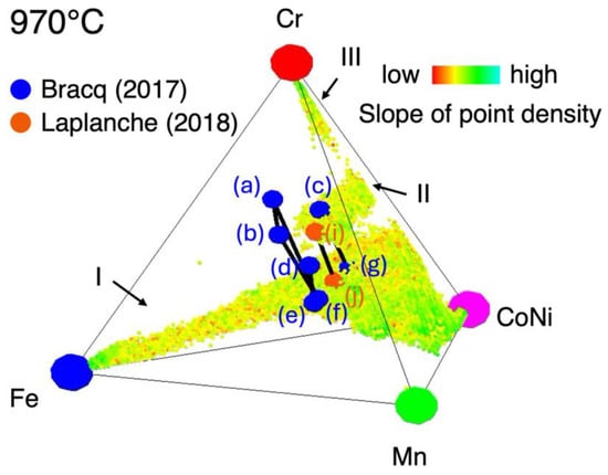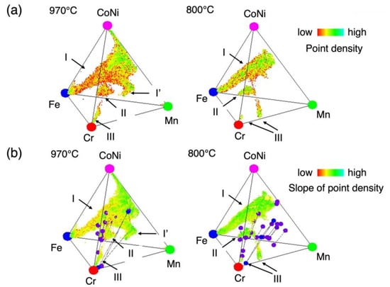There are three regions recognized in the slope of point density map; the first one is the region which has the largest volume extended to Fe from the Co/Ni–Cr–Mn plane and is labeled as “I” in the figure. The second one, “II”, is the region that is located on the Cr-richer side of region “I”. And then, the last one, “III”, is the region close to the Cr-vertex, which is thought to be the Cr phase.