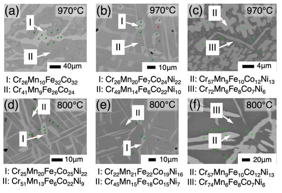 Microstructures observed in samples prepared in the conventional method. The annealing temperature is 970 °C for (a–c) or 800 °C for (d–f). The compositions shown below each micrograph are those, in atomic fractions, measured by electron-probe microanalysis at green and red dots for respective phases in the images.