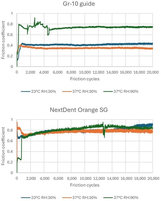 - The pronounced impact of elevated temperature and humidity on the tribological properties of the tested materials suggests that in vivo conditions can considerably influence material performance.