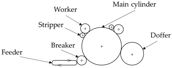Various studies have already demonstrated the feasibility of carding rCFs with thermoplastic fibers. Hengstermann et al. [11] were able to card 40 mm and 60 mm long rCFs, and highlighted the influence of fiber length at the card infeed. In another study, a core-sheath yarn was produced, also with 60 mm carded rCFs in the core, with a co-polyamide as a sheath [12]. Also, it has been shown that crimped polypropylene helped with mixing and carrying rCFs, diminishing fiber breakage through the carding process [13]. This approach aligns with previous works where polyamide and polyester were used as carrier fibers in blends with rCFs [14]. The morphological and mechanical properties of the fibers and the resulting web are influenced by both the material properties and the machine parameters during carding. For example, Manis et al. [15] were able to demonstrate that a higher number of worker/stripper pairs led to a greater degradation of 60 mm fiber length. Another study looked at the influence of the distance between the worker and the stripper on the length of the fibers leaving the carding machine [12]. A higher clearance between the worker and stripper led to lower fiber length degradation.