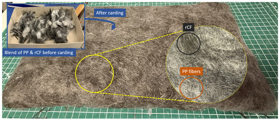 The carding process is a preparatory step in the manufacturing of these materials. Carding disentangles and cleans fibers while forming a continuous web, which serves as a base for further processing. Depending on the intended application, this process can lead to different pathways: the production of nonwoven materials, or the preparation of webs with doubling and drawing steps, which improve fiber alignment and enhance structural uniformity. Another advantage of the carding process is its ability to create hybrid structures by blending rCFs with thermoplastic fibers, making it a suitable option for producing thermoplastic composites.