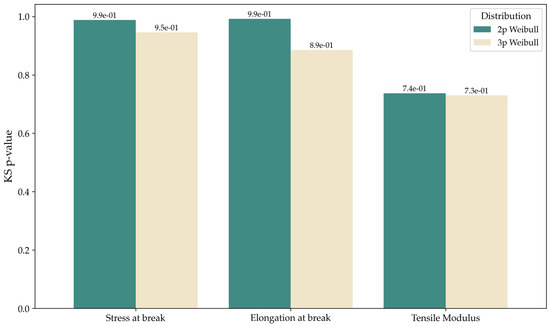 The tensile properties of recycled carbon fibers are experimentally identified, as described in Section 2.2, and the data are fitted to two Weibull models, the two-parameter model and the three-parameter model. The parameters estimated by MLE are then compared with the actual distribution using the K-S test. Figure 4 gives an example of the K-S test p-values calculated on recycled fibers before carding, for the three tensile parameters under study, and for the Weibull distributions with two and three parameters.