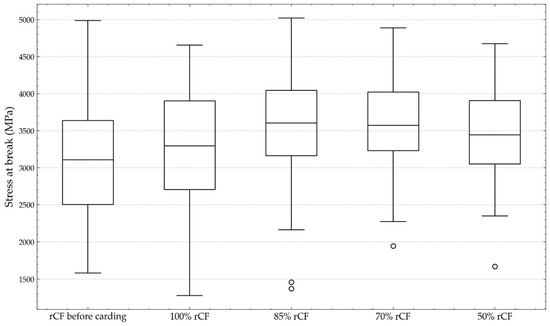 From the values in Table 1, the average stress at break for each batch of fiber showed no significant change in terms of standard deviations. Before carding, the average stress at break of the rCF was 3143 ± 773 MPa. All the stress-at-break values after carding, regardless of the proportion of polypropylene fiber in the blend, are within this standard deviation value.
