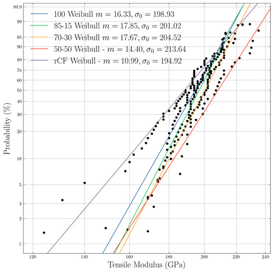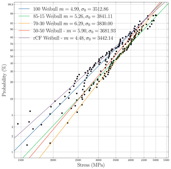 The MLE technique is used to obtain a mean value and a standard deviation on the calculated Weibull modulus values. It can already be noted that the number of tests has a significant impact on the standard deviation of the Weibull modulus. In fact, for the 50–50 blend, whose dataset contains 20 fewer usable trials than the 100% rCF batch, the standard deviation rises from 0.59 to 0.92 (Table 2).
