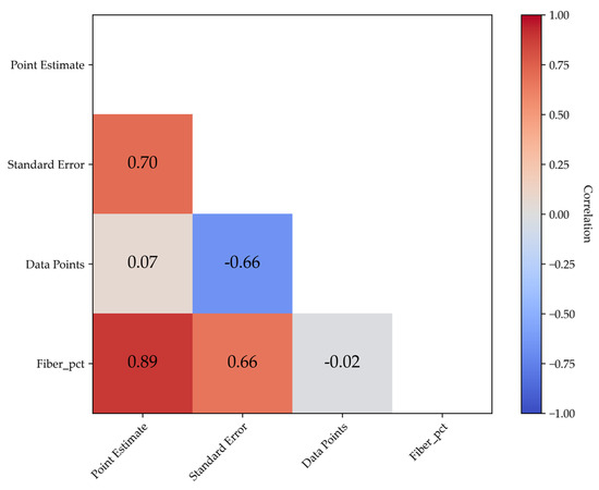 The heatmap shown in Figure 8 can be used to describe the relationships between two variables by calculating the Pearson coefficient. An absolute value close to one indicates a strong linear correlation between two variables. The “Fiber_pct” variable corresponding to the fiber content in the web shows a strong and positive correlation (0.89) with the value of the Weibull modulus in the tensile modulus, denoted “Point Estimate” in Figure 8.