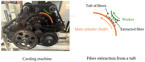 Also, if the force applied to extract the fiber exceeds its resistance, the fiber will also break. The extracted fiber is subjected to successive tensile forces, which can either cause it to break or to be extracted from a tuft of fibers. Linked to the observation made by Bunsell et al. [39] on cyclic tensile tests for carbon fibers, this mechanism within the carding machine provides the beginnings of an explanation for the increase in tensile modulus values and stiffening, but also for the homogenization of values resulting in an increase in Weibull modulus values.