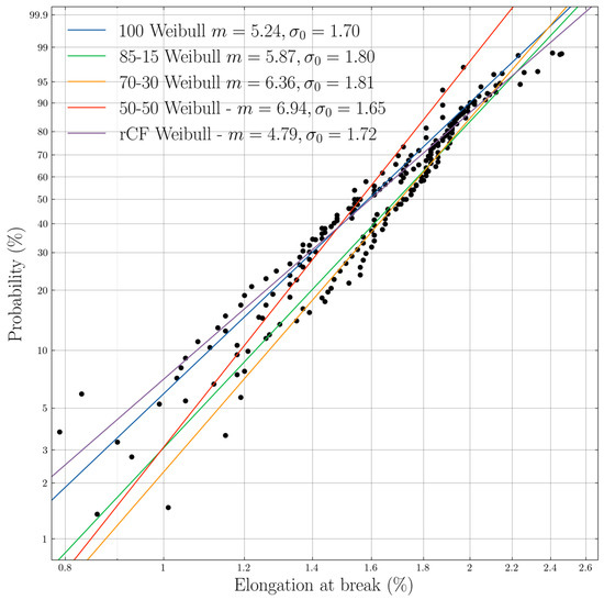 The p-values in Table 4. further confirm the good fit of the Weibull two-parameter model to the experimental data, except for the 15–85 rCF blend, where the p-value is noticeably lower. This deviation suggests that the two-parameter Weibull model may not fully capture the distribution of elongation-at-break data for this specific blend. While no definitive explanation is available for this anomaly, it is worth noting that when a three-parameter Weibull model is applied (Table A1), the p-value for the 15–85 rCF blend remains similarly low.