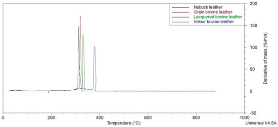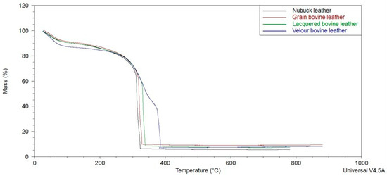 Thermal analysis of the analysed leathers was performed using the dynamic technique according to PN-EN ISO 11358:2014 (Plastics. Thermogravimetry (TG) of polymers. General rules) [
