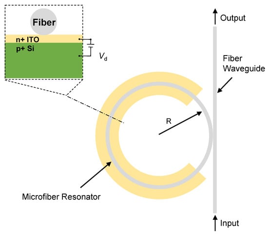 Figure S2 (Supplementary Materials) illustrates the distribution of the optical field within a fiber-optic micro-ring resonator, with the field intensity biased towards the inner side. By solving the Schrodinger equation of the evanescent wave numerically, the intensity distribution and phase of the evanescent field propagating along the micro-nano fiber ITO optical waveguide are influenced by ITO material [37]. Upon integration with the device, a portion of the evanescent field of the TE mode in the micro-ring couples into the device, interacting with the material and altering the overall optical field distribution. The application of a reverse bias voltage leads to a change in the carrier concentration within the ITO, approaching the Near-Zero Electron Number Density (NENZ), which results in a significant modification of the ITO’s refractive index. The effective refractive index of the micro-ring is significantly altered by the influence of the evanescent field, as demonstrated in equation, where represents the effective refractive index of the MKR.
