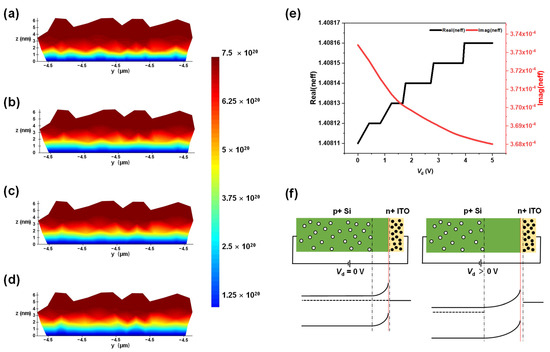 Figure 1c illustrates the voltage-dependent carrier concentration in the ITO region of the heterojunction device for varying thicknesses of the Si layer. The voltage-dependent carrier concentration curves are obtained by solving the Poisson equation and the drift-diffusion equation simultaneously. This voltage-dependent characteristic is directly related to the material’s own properties, including the electrostatic potential and the free carrier density. The initial doping concentration of the ITO layer in the device is contingent upon the oxygen content during the fabrication process of the ITO film. The carrier concentration decreases with an increase in oxygen content, while the mobility exhibits a trend of initial increase followed by a subsequent decrease as the oxygen content increases [32]. In order to comprehensively consider carrier concentration and mobility to achieve an optimal modulation effect, the initial doping concentration of the ITO layer is set to 7.5 × 1020 cm−3. Considering the impact of the doping concentration on the depletion layer width and the built-in electric field and potential in a PN junction [33], the initial doping concentration of the Si layer is set to 8.5 × 1018 cm−3. It is evident that, for a fixed thickness of the Si layer, the carrier concentration decreases significantly with increasing voltage, with a change on the order of magnitude of 1019 cm−3. Furthermore, as the thickness of the Si layer increases, the dependence of the carrier concentration variation in the ITO layer on voltage also increases, indicating that a larger Si layer thickness is conducive to achieving a greater modulation depth in the modulator. If a high doping concentration is used in Si layer, the waveguide loss will increase; therefore, when the ITO doping concentration is 7.5 × 1020 cm−3, the Si doping concentration is 8.5 × 1018 cm−3 with a thickness of 1500 nm, which is more capable of fully leveraging the ENZ effect of ITO. Note that the formulas used here do not take into account other effects that the device may have, such as thermo-optical effects, making the results somewhat limited. The difficulties encountered in the production of this type of heterojunction structure include the precise control of carrier concentration and the contact quality at the heterojunction interface, etc.