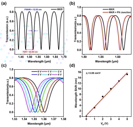 In this formula, represents the coupling loss, is the coupling coefficient, is the propagation constant, and L is the circumference of the MKR. Micro-ring resonators exhibit a resonance phenomenon, which refers to the occurrence of resonance within the micro-ring resonator when the wavelength of the light wave passing through it matches the resonant wavelength () of the micro-ring resonator. Specifically, resonance occurs when the optical path length of the micro-ring resonator is an integer multiple of the light wavelength. The resonant wavelength is directly related to the geometric dimensions of the micro-ring resonator and the refractive index of the light wave; any slight change can cause a shift in the resonant wavelength. Therefore, micro-ring resonators are considered an ideal platform for electro-optic modulators. Figure 4a presents the transmission spectrum of an all-fiber micro-ring resonator. It can be observed that the MKR exhibits excellent resonance characteristics, with a free spectral range (FSR) of 43.88 nm, a full width at half maximum (FWHM) of 12.02 nm, and under the condition that the is 1550 nm, a quality factor (Q) defined as . Figure 4b and Figure S3 (Supplementary Materials) depict the transmission spectra of the micro-ring resonator before and after coupling with the PN heterojunction device, as well as the variation curve of the group refractive index of the optical fiber resonator. Based on the resonance characteristics of the micro-ring resonator, the relationship between the spectral shift and the group refractive index can be expressed as [40,41,42]