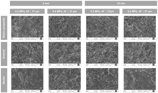 Representative SEM images showed roughened surfaces after sandblasting in the case of all assessed working settings. Also, a comparable surface topography throughout all working settings was observed. In addition, remnants of abrasive particles were visible, and dentine specimens showed an occlusion of dentinal tubules, presumably due to the smear layer and sandblasting, as images were taken prior to the application of phosphoric acid and the subsequent water-rinsing. This observation is in line with the REM analysis in a previous study showing roughened enamel surfaces and damaged dentin surface, including remnants of abrasive particles and covered dentinal tubules after sandblasting [12].