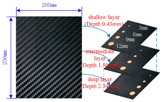 The dimensions of the delamination defect specimen were 250×200 mm, with a thickness of 3.0 mm, as shown in Figure 1. The raw material was Toray T300 woven carbon fiber twill prepreg (FAW200/69). With a mass per unit area of 200 g/m2 and a nominal thickness of 0.25 mm, the specimen was laid in [90/0]7 with 14 layers, with the 0° direction aligned with the long side. Delamination defects were prepared by pre-burial of polyimide film between layers with a film thickness of 0.025 mm. The specimen layering and defect burial are illustrated in Figure 1, which depicts three pre-burial locations: a shallow layer (between layers 2 and 3), an intermediate layer (between layers 7 and 8), and a deep layer (between layers 11 and 12). Three circular defects with a diameter of 12 mm were created in the shallow layer (between layers 2 and 3), four with a diameter of 9 mm in the intermediate layer (between layers 7 and 8), and six with a diameter of 6 mm in the deep layer (between layers 11 and 12). When the polyimide film was pre-buried into the pavement layer, an appropriate amount of release agent was applied via spraying to prevent it from adhering to the prepreg pavement layer and effectively prevent it from distorting and deforming during the curing process of the specimen. The specimens were prepared using a hot press tank molding process. Following lay-up, the specimen blanks were sealed in vacuum bags and subsequently placed in the hot press tank after vacuuming. The curing temperature and pressure were 130 °C and 600 kPa, respectively.