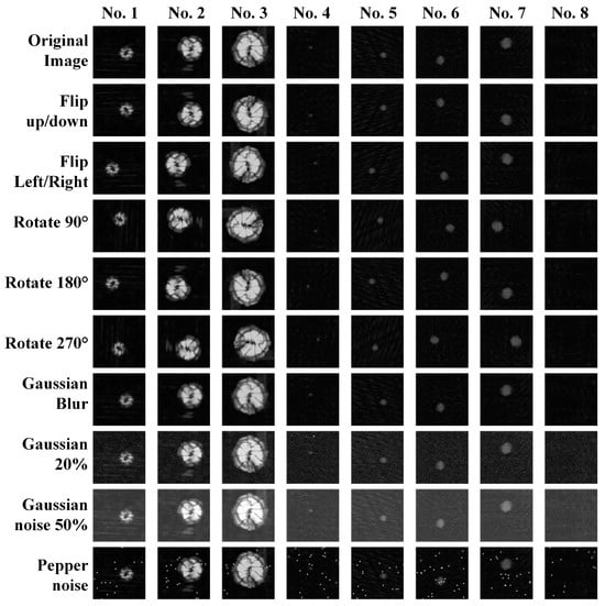 Figure 4 illustrates the original images and the corresponding enhanced images for a variety of sample types. The addition of Gaussian noise with a mean of 20 and variance of 5, indicated by 20% Gaussian noise, and the addition of Gaussian noise with a mean of 50 and variance of 2, indicated by 50% Gaussian noise, are represented in the images. The blur radius of the Gaussian blur was set to 0.5. The mean value of the salt-and-pepper noise was set to 0, with a variance of 0.4.