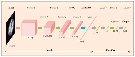 In order to achieve the efficient and high-precision classification of different classes of defects inside composite materials, this paper proposes and designs an autoencoded classifier (AEC), the network structure of which is shown in Figure 5, which contains an encoder and a classifier. The network takes the single-channel ultrasound C-scan image directly as input, which can be denoted as , which firstly undergoes the step-by-step two-dimensional convolution of the encoder, and then undergoes a fully connected layer, which outputs a one-dimensional feature vector with a length of 64, which can be denoted as . Finally, the feature vector is input to the classifier, which ultimately outputs a one-dimensional vector with a length of 8, representing the possible probability of belonging to the above 8 classes of defects. The possible probability of defects belonging to the above 8 classes can be denoted as . To make the dimensionality analysis clearer, the following provides a detailed step-by-step dimensionality change analysis incorporating the network structure in Figure 5: