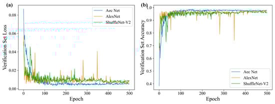 In order to facilitate a comparative and analytical assessment of the performance advantages and disadvantages of AEC networks, this paper selected the most representative state-of-the-art network models in the field of image classification, namely, AlexNet [30] and ShuffleNet-V2 [31], for simultaneous training. The three network models were trained using the same dataset and training hyperparameters throughout the training process. Ultimately, 500 rounds were trained with the identical loss function with the same hardware and software environment. The details are consistent with the descriptions in the aforementioned sections and are not repeated here.