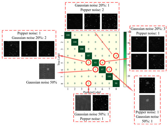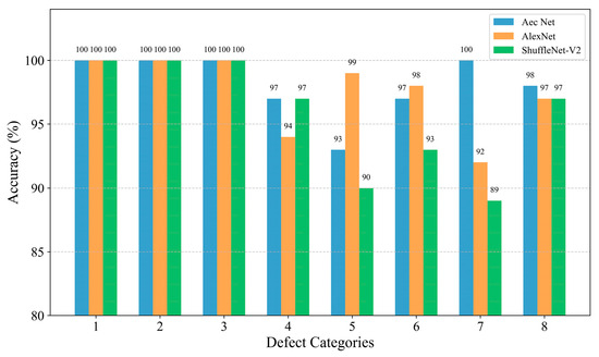 In order to further analyze the network’s ability to extract features from data with different types of defects, firstly, the confusion matrix was drawn based on the classification of each type of defect in the test set, as shown in Figure 7. The confusion matrix visualizes the model’s predictions on different categories and is a commonly used tool for evaluating the performance of classification models. The core idea is to compare the true labels with the predicted labels and generate a matrix where each element of the matrix represents the model’s prediction on a specific category [32]. Given that the AEC network was utilized for the identification and classification of defects, the implementation of statistical analysis through linear regression [33] was rendered unnecessary. The classification accuracy of each type of defect is plotted as a histogram based on the confusion matrix, as shown in Figure 8, and is quantified in Table 8.