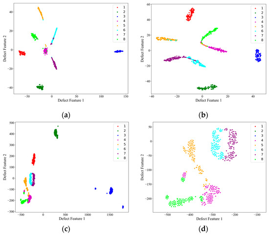Then, on the test set, the image features extracted from the encoder structure of each network, i.e., the encoder output F described above, were subjected to PCA downscaling and visualized, and the results are shown in Figure 9. Figure 9d shows a local zoom of the red-boxed region in the PCA feature downscaling plot of the AEC network. Combined with the confusion matrix in Figure 7, it can be seen from the feature downscaling plots that all three networks had the strongest feature extraction ability for defects 1, 2, and 3, which corresponded to the red, green, and blue colors, respectively, and the feature boundaries were completely independent from each other and from the other classes of defects. For AlexNet and ShuffleNet-V2, there was a strong coupling between the features of the other classes of defects, and, from Figure 9d, it can be seen that the AEC network was more capable of distinguishing the features of the other defects and had the lowest coupling, despite the fact that the defect feature boundaries were connected.