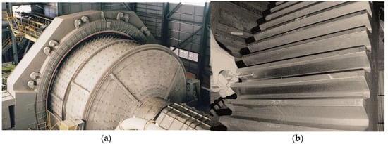 In the manufacturing of large gears for the transport industry and for the mining of minerals, layered ductile cast iron is often used. In large and costly mining plants, individual structural assemblies and components receive special attention during the design phase or during operation. This is because they determine the performance of the whole structure and downtime for repairs is very costly. The use of ductile iron reduces the weight of the structure and ensures durability and reliability. Modern mineral mills used in mining have drum diameters exceeding 12 m and gross weights of 3800 t (Figure 1a) [18,19]. The structural elements of the mineral mills are made of ductile cast iron (body and supporting structural components) and austempered ductile cast iron alloy (e.g., transmission gears, Figure 1b) [19]. The required durability of the structures (more than 25 years) can only be achieved by using the latest technologies in design, manufacture, and operation [20,21,22,23,24,25,26].