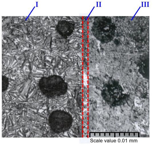 Figure 2. Structures of CT specimens: I—tempered layer (martensite, spheroidal graphite, ~28–36 mm); II—intermediate layer (martensite, trostite, ferrite, perlite, and graphite, ~4 mm); and III—mild layer (perlite, ferrite, graphite, ~10–15 mm) [48].