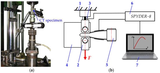 Figure 3. CT specimen fixture on the TIRA test 2300 machine (a) and the experiment scheme (b): 1—the body of the testing machine; 2—grip; 3—dynamometer; 4—compact tension specimen; 5—crack opening strain gauge; 6—computer metering system Spyder-8; and 7—computer.