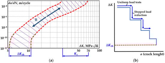 This is applied until a value of Δ K is obtained at the required fatigue crack growth rate d a / d N . The Δ F step size must not exceed 10% as the force is progressively reduced and the gap growth between these steps should not be less than 0.50 mm. The Δ K reduction test scheme is shown in Figure 4b. As the threshold is approached, the force changes become very small. At the microscopic level, the fatigue crack is known to propagate in spikes. The size of the spike represents only a few parameters of the crystal lattice. This step growth is associated with a loss of plasticity and the appearance of small cracks in the crack tip environment. When the number of small cracks reaches a critical number, the crack growth jumps. The fracture threshold is determined using a force value at which the fracture velocity is no longer recorded. The arrows indicate the direction in which the load is changed by setting the parameters Δ K t h and K c . If Δ K t h is required to calculate the cyclic strength, then only a plot of the crack growth rate versus the range of the stress intensity factor is produced (part of the kinetic diagram). After the determination of Δ K t h (Figure 4a, loading arrow B), a CT specimen with a crack was used to determine the fracture toughness using static testing (Figure 4a, loading arrow A).