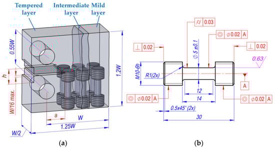 Following the partial thermal treatment, residual stresses developed in individual parts of the CT specimens due to the structural change, which affects the fatigue failure process. Following the thermal treatment, the hard layer remained tensioned, and the mild layer was subjected to compression. An intermediate layer of various dimensions was formed between the hard and mild layers. As a result, residual stresses developed. The main dimensions of the CT specimens are presented in Figure 5a.