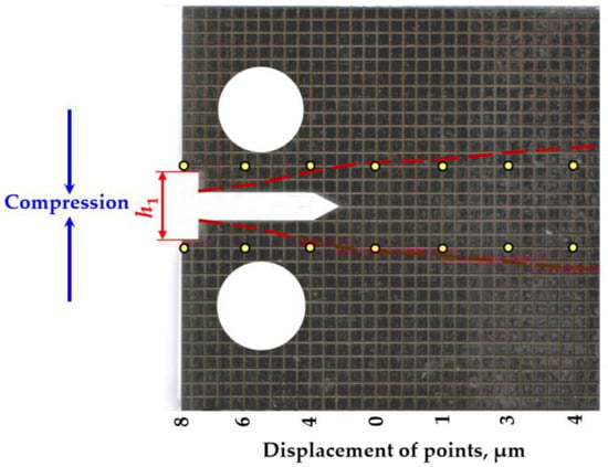 A special example (H3) (Figure 6) of partially thermal-treated specimens was prepared to investigate the deformation of the CT specimens. The preparation of the specimen consisted of several stages. The H3 specimen was made according to the dimensions of the previously described specimens. Subsequently, a grid (2 × 2 mm) was made on the side surface of the specimen using a laser. Next, a measuring notch was made and the distance between individual points was measured. The notch and holes were then cut according to ASTM [49] and the variation between the same points was measured. The measurement results are presented in Figure 6. Residual stresses resulted in a grid distortion that reflected the deformations perpendicular to the notch. The red dashed lines in Figure 6 show the distribution of residual stresses in the prepared specimen.