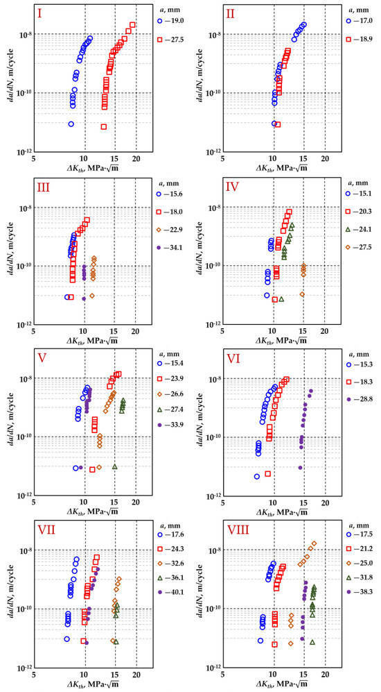 For partially thermal-treated cast iron, the cyclic fracture process was analyzed using CT specimens. During the tests, the fracture threshold, Δ K t h = 8 17   M P a m , was determined for eight specimens according to [48,49] (Figure 7).