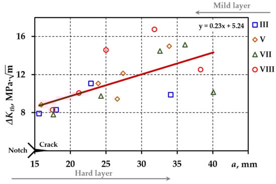 The analysis of the relationships between the fracture threshold and the crack sizes shows that the threshold increases as the crack approaches the intermediate and mild layers and decreases as it enters the mild layer (specimens VII and VIII). The maximum magnitude of Δ K t h is reached just before the intermediate layer.