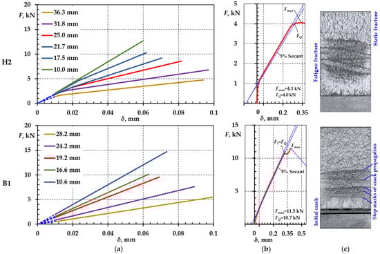 During the experimental study, periodic static loading and measurement of the specimens with cracks were performed. Due to the complexity of the testing process, samples H1, H2, and B1 were selected for further analysis. The scheme applied to the CT specimen static fracture test is shown in Figure 3, Figure 4 and Figure 5. The resulting dependences of force value F and crack opening δ are shown in Figure 9.