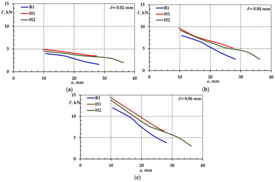 Figure 10. Dependence of force on crack depth and crack opening: δ = 0.02 mm (a), δ = 0.04 mm (b), and δ = 0.06 mm (c).