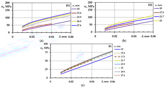 Figure 11. Normal stresses at the crack tip depending on crack depth a and crack opening δ in CT specimens: H1—(a); H2—(b); and B1—(c).