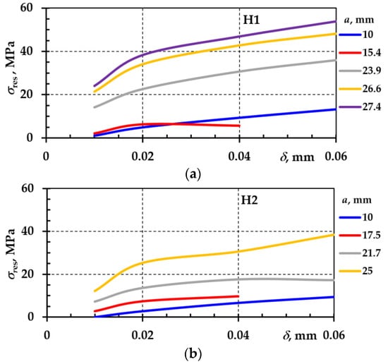 The variation in normal stresses at the crack tip depending on the crack depth and opening is presented in Figure 11. The residual stresses remained in the material even after the stress sources were removed.