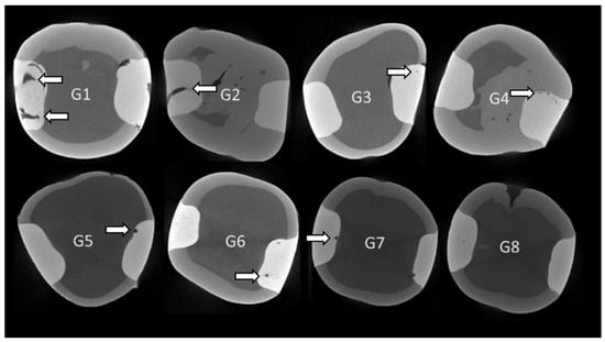 Micro-CT images of void formation. The black areas inside the resin composite applied in the Class II cavities correspond to voids (arrows) in the material. G1—Filtek Universal (incremental technique) at room temperature; G2—Filtek Universal (injected) preheated at 68 °C; G3—Filtek One Bulk-Fill (injected) at room temperature; G4—Filtek One Bulk-Fill (injected) preheated at 68 °C; G5—Admira Fusion X-tra Bulk-Fill (injected) at room temperature; G6—Admira Fusion X-Tra Bulk-Fill (injected) preheated at 68 °C; G7—VisCalor Bulk-Fill (injected) at room temperature; G8—VisCalor Bulk-Fill (injected) preheated at 68 °C.