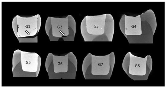 Micro-CT images representing the marginal adaptation analysis in the cervical margin at dentin for the different groups. The arrows indicate marginal gaps. G1—Filtek Universal (incremental technique) at room temperature; G2—Filtek Universal (injected) preheated at 68 °C; G3—Filtek One Bulk-Fill (injected) at room temperature; G4—Filtek One Bulk-Fill (injected) preheated at 68 °C; G5—Admira Fusion X-tra Bulk-Fill (injected) at room temperature; G6—Admira Fusion X-Tra Bulk-Fill (injected) preheated at 68 °C; G7—VisCalor Bulk-Fill (injected) at room temperature; G8—VisCalor Bulk-Fill (injected) preheated at 68 °C.