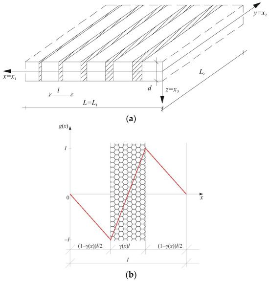 (a) A fragment of a thin functionally graded plate with an a-type tolerance-periodic (non-periodic) microstructure; (b) a cell of the plate with a saw-type fluctuation shape function.