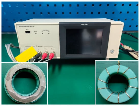 where le and Ae represent the equivalent magnetic path length and the cross-sectional area of the nanocrystalline magnetic ring, respectively; f is the excitation frequency; μ0 is the permeability of vacuum; Ncoil is the number of turns; L and R are the measured inductance and resistance, respectively; and Rw is the resistance of the wire. The relationship between R and Rw is as follows: