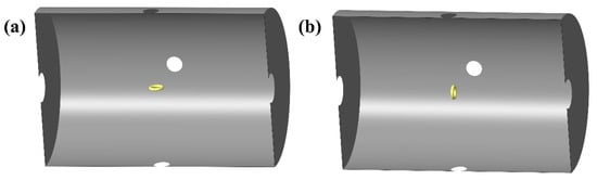 Figure 3. Simulation model of magnetic noise of cylindrical nanocrystalline magnetic shield at orthogonal directions: (a) radial direction and (b) axial direction.