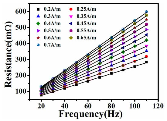 where A is a constant. By measuring R under the different excitation frequencies (20–110 Hz), Rw was acquired after the linear fitting. Because the LCR meter cannot directly apply the specific magnetic field strength to the magnetic ring, the magnetic field intensity needs to be converted into current according to the following formula: