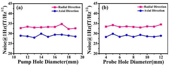 Figure 6. The simulated 1 Hz magnetic noise of the cylindrical nanocrystalline magnetic shield considering (a) different pump hole diameters and (b) different probe hole diameters.