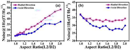 Figure 7. The simulated 1 Hz magnetic noise of the cylindrical nanocrystalline magnetic shield considering an aspect ratio range of 1–2: (a) the different diameter and (b) the different length.