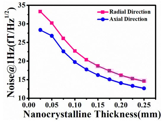 The layer thickness of the nanocrystalline magnetic shield is another factor that affects the magnetic noise. As a result, it is necessary to analyze the 1 Hz magnetic noise of a nanocrystalline magnetic shield with different layer thicknesses. Figure 8 illustrates the relationship between the 1 Hz magnetic noise and the layer thickness. It can be clearly seen that increasing the layer thickness can lead to a decrease in the magnetic noise. The details are as follows: the radial and axial magnetic noise of the single-layer nanocrystalline magnetic shield are 33.32 fT/Hz1/2 and 28.36 fT/Hz1/2, respectively. When the number of nanocrystalline layers increases to ten, the magnetic noise can decrease to 14.59 fT/Hz1/2 and 12.67 fT/Hz1/2, respectively. Although the magnetic noise can be reduced by increasing the layer thickness of the nanocrystalline magnetic shield, the layer thickness that is too excessive is not suitable for the winding of a cylindrical nanocrystalline magnetic shield. Consequently, the correct layer thickness is crucial during the design process of a nanocrystalline magnetic shielding cylinder.