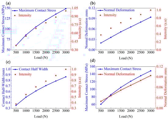 Parameters obtained at applied normal forces of 500–3000 N: (a) maximum contact stress and normalized light intensity, (b) normal deformation and normalized light intensity, (c) contact half-width and normalized light intensity, and (d) maximum contact stress and normal deformation.