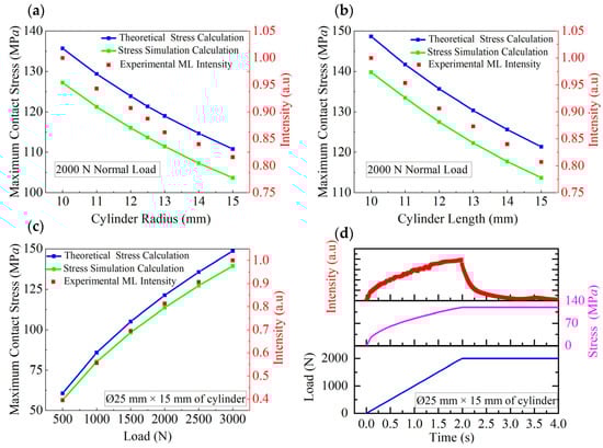 Maximum contact stress and corresponding light intensity plots constructed for ML cylinders. (a) Cylinders with various radii under a normal load of 2000 N. (b) Cylinders with various lengths under a normal load of 2000 N. (c) Cylinders under different normal loads (fixed: l = 15 mm, r = 12.5 mm). (d) Time-dependent curves obtained under incremental normal loading (fixed: l = 15 mm, r = 12.5 mm).