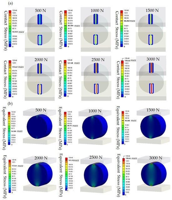 Figure 3 shows the stress contours from finite element simulations of an ML cylinder with a radius r = 12.5 mm and a length l = 15 mm obtained under normal compression. Figure 3a presents the contact-stress distribution contour for loads ranging from 500 to 3000 N, while Figure 3b displays the equivalent stress distribution under the same conditions. Supplementary Figures S3 and S4 further show the finite element simulated stress contours obtained for the ML cylinders under a load of 2000 N. In particular, Figure S3a,b display the contact stress and equivalent stress for the cylinders with radius r = 12.5 mm and lengths l = 10–15 mm, while Figure S4a,b depict the stress distributions obtained for the cylinders with length l = 15 mm and radii r = 10–15 mm. The simulation contours reveal the stress distributions under different load conditions and cylinder sizes, indicating that the maximum contact stress and the equivalent stress are nearly identical under uniaxial normal loading.